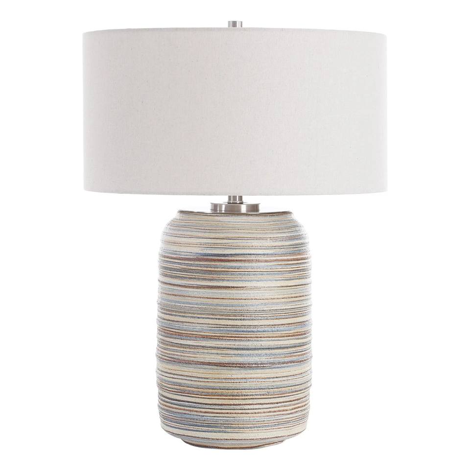 Blue Ribbed Ceramic Urn Modern Table Lamp with Gold Accent | Artisan Stylish Lighting for Hotel Feature Space & Lounge