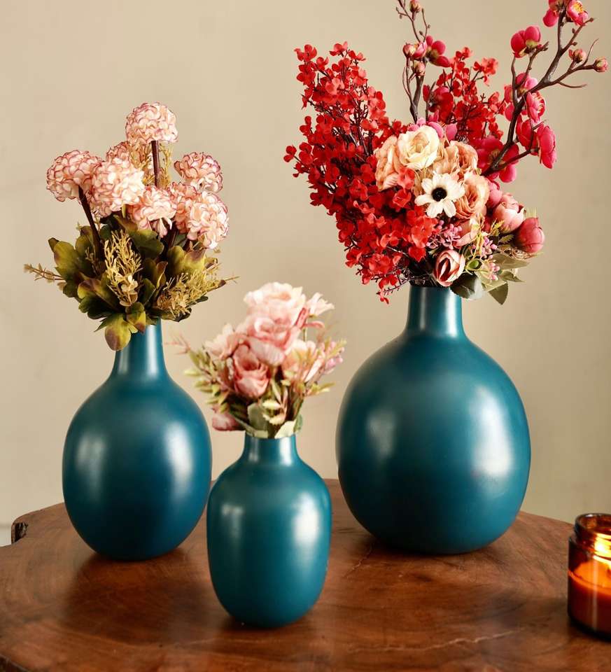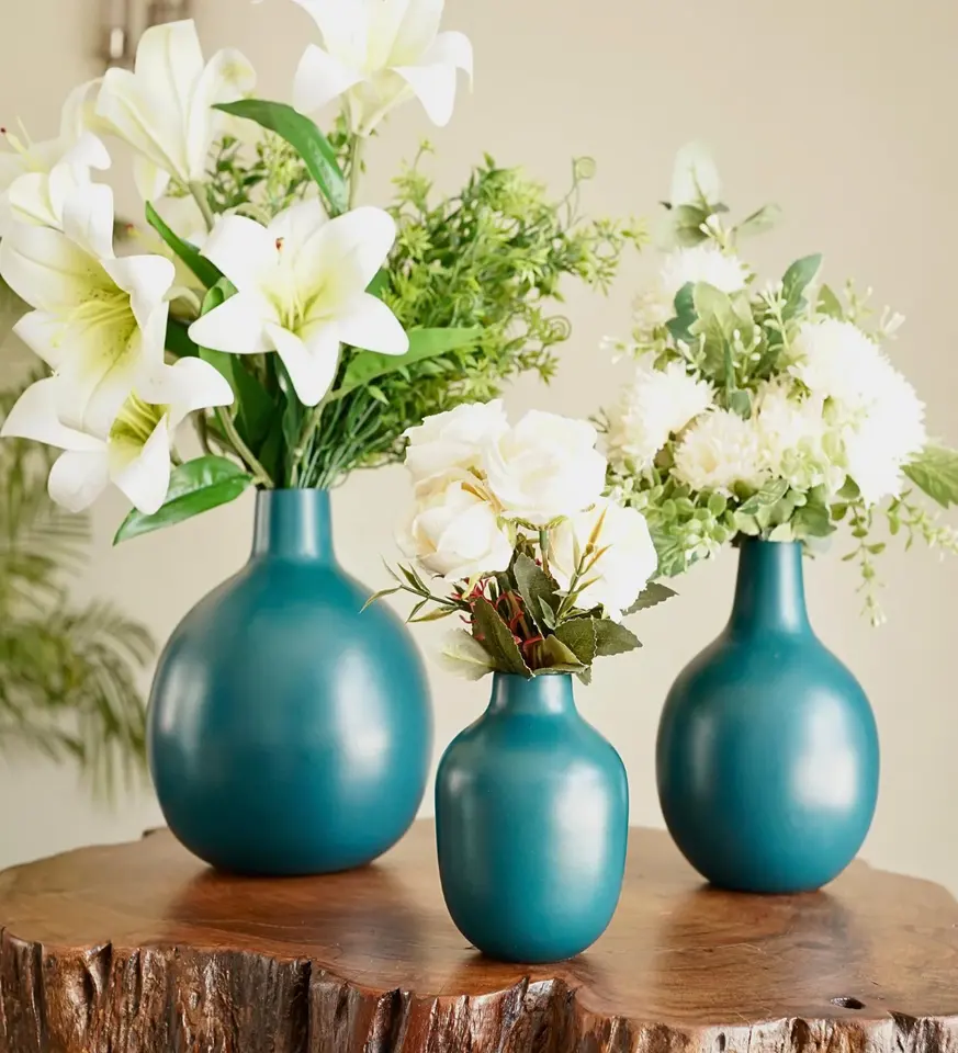 Blue Round Iron Flower Vases for Living Room, Decorative Tabletop Round Metal Flower Vases for Home, Office & Bedroom