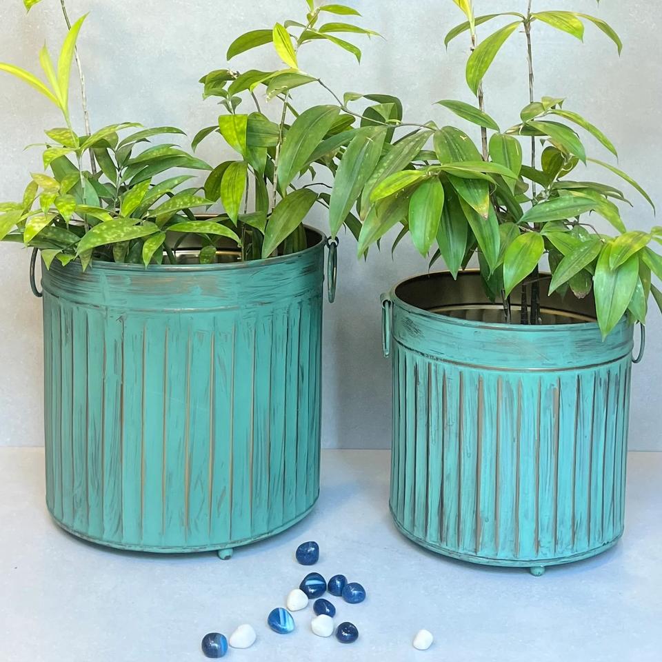 Blue Round Ribbed Patina Planter Modern Metal Planters Garden Supplies Iron Planter Small and Large Decorative Indian Flower Pot