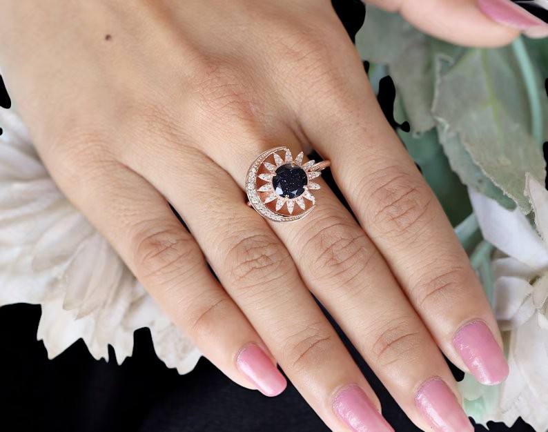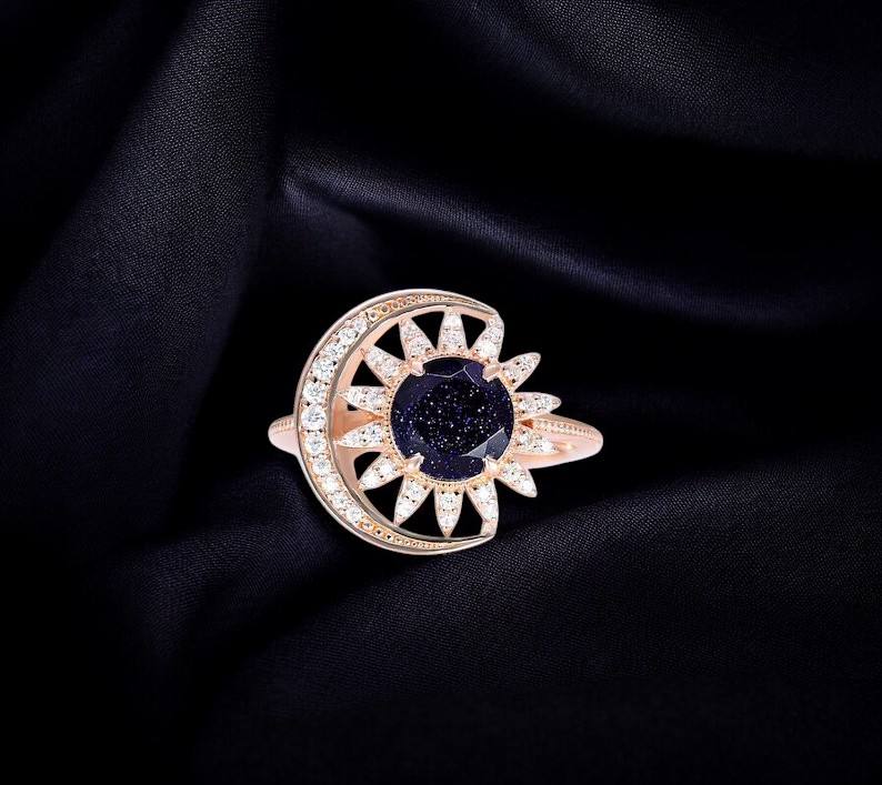 Blue Sandstone Star Moon Cut 925 Sterling Silver Women's Wedding Engagement Ring Unique Gold Plated Jewelry for Parties Gifts