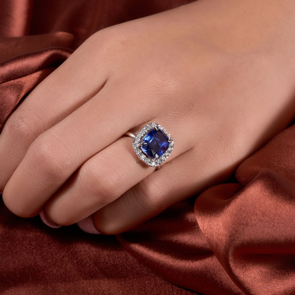 Blue Sapphire Cushion Cut Engagement Ring with Moissanite Halo White Gold Sapphire and Moissanite Ring Round Accent Stones