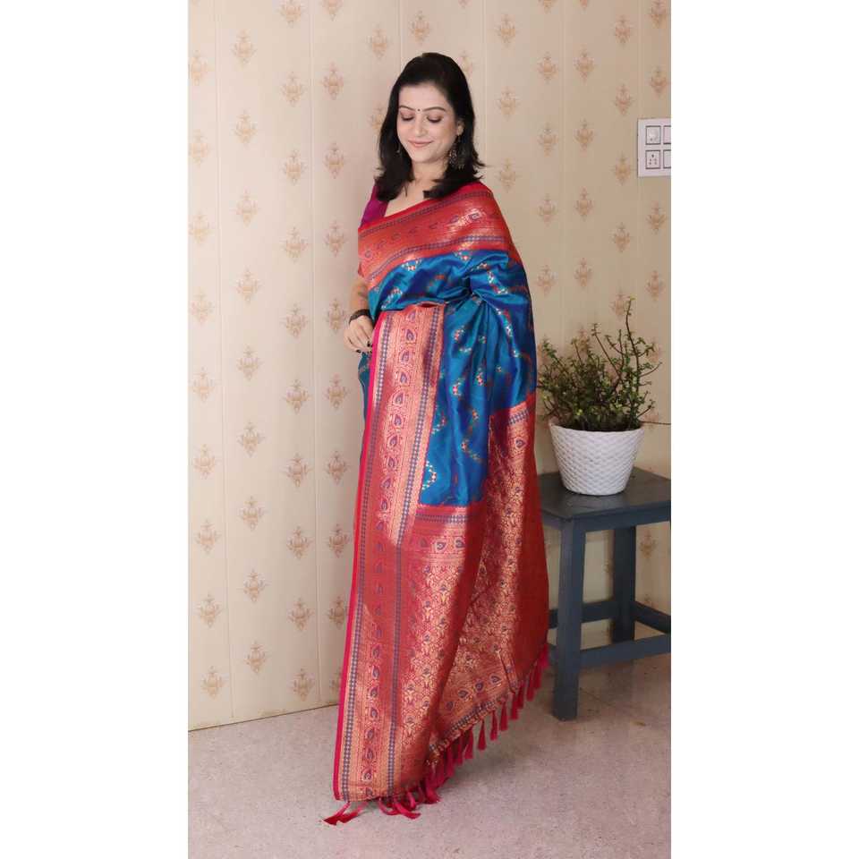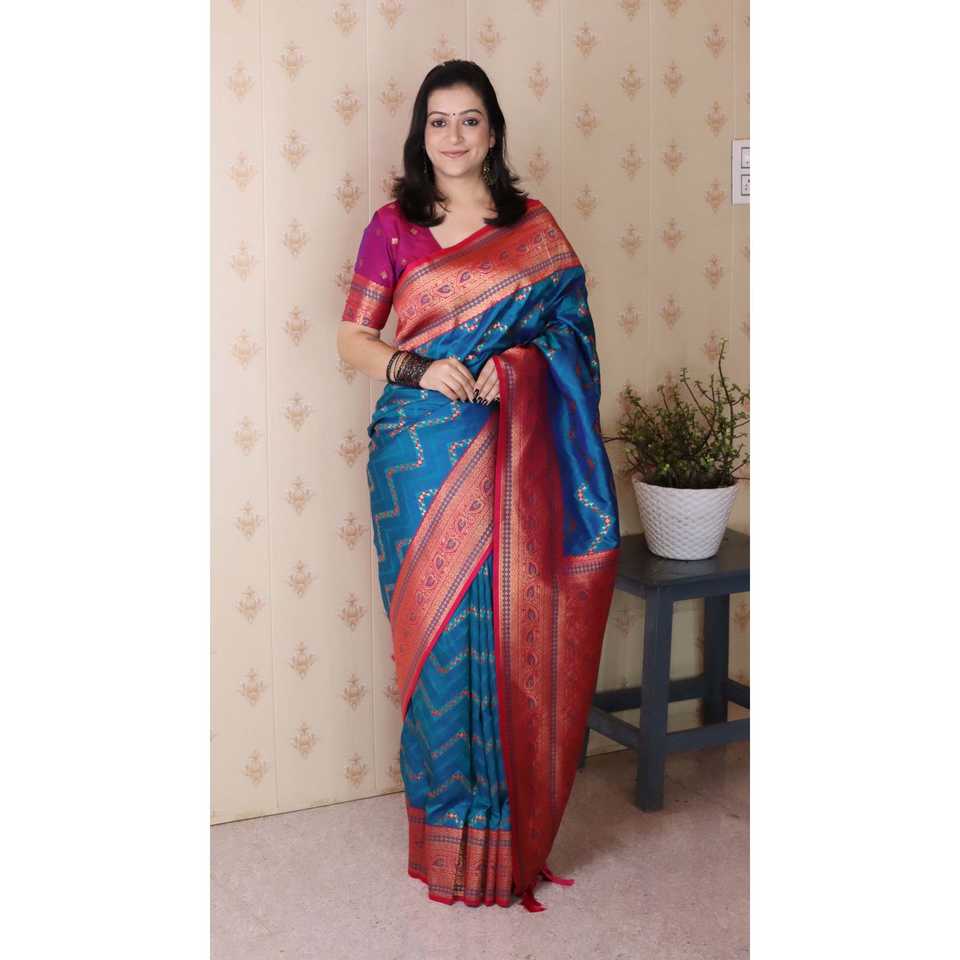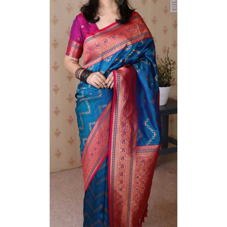 Blue Soft Silk Banarasi ZigZag Meenakari Zari Woven Saree Indian & Pakistani Clothing Elite Weaves 650g