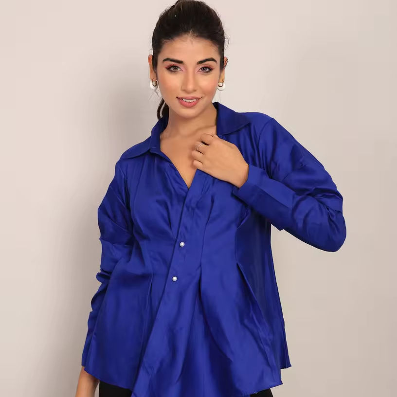 Product Name:Blue Solid Summer Relaxed Top With Collar Neckline