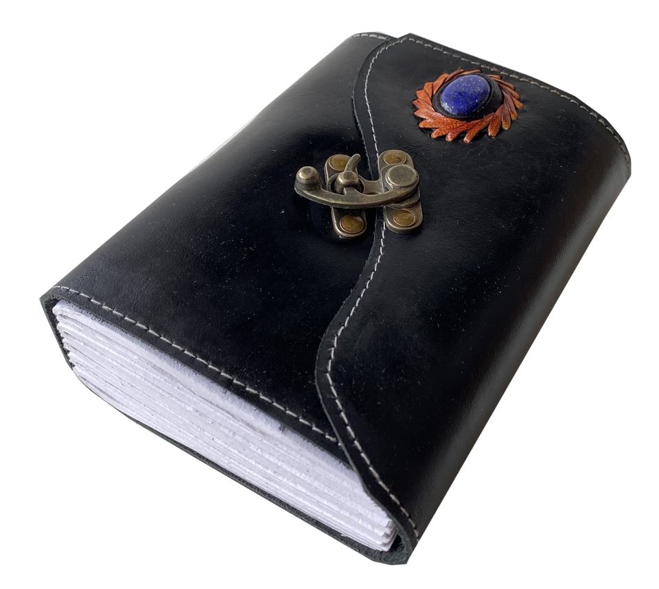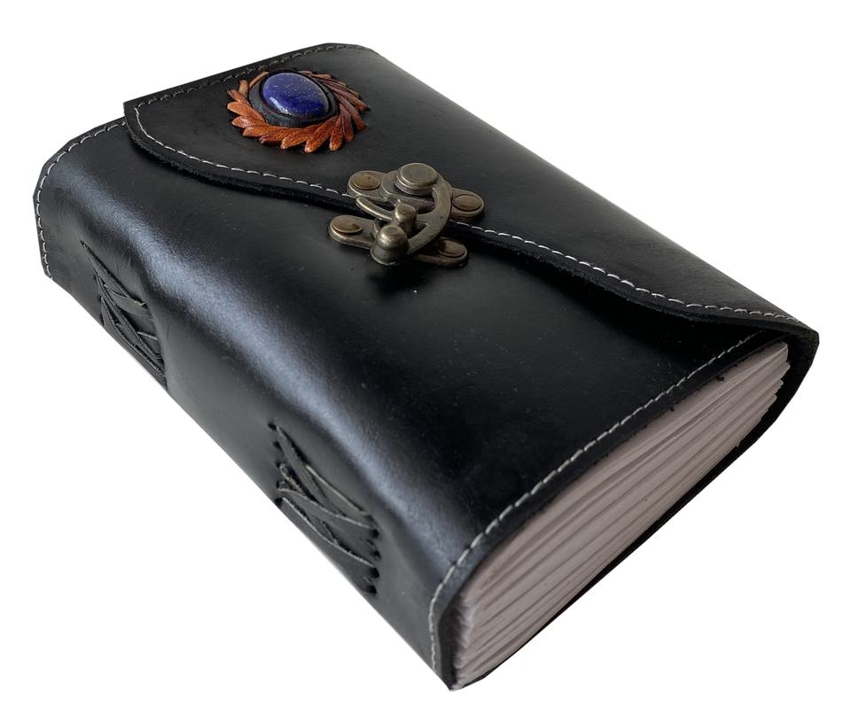 Blue Stone Embedded Plain Handmade Black Soft Genuine Leather Journal Book Of Shadow Unlined White Paper Flap Brass C-Lock Diary