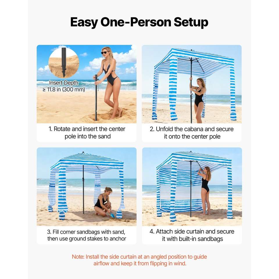 Blue Striped 6 X 6 ft Beach Cabana Tent Portable UPF 50+ Sun Shelter Umbrella Easy Setup Sand Pockets Canopy for Whole Family