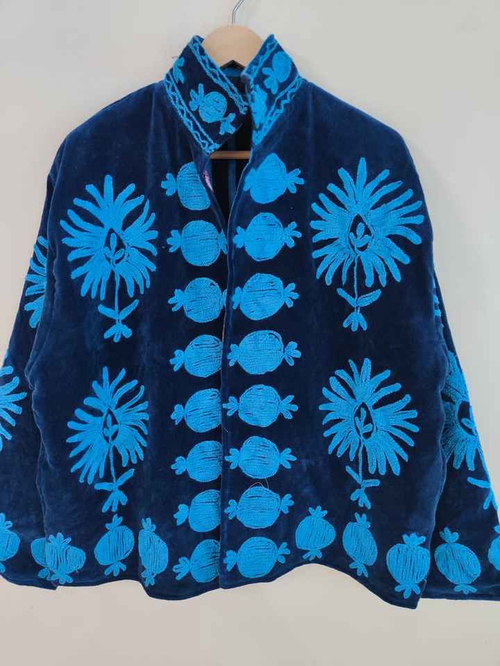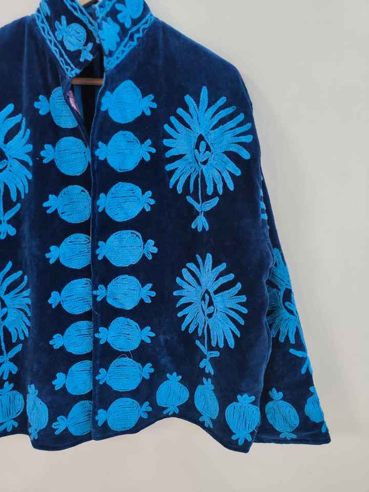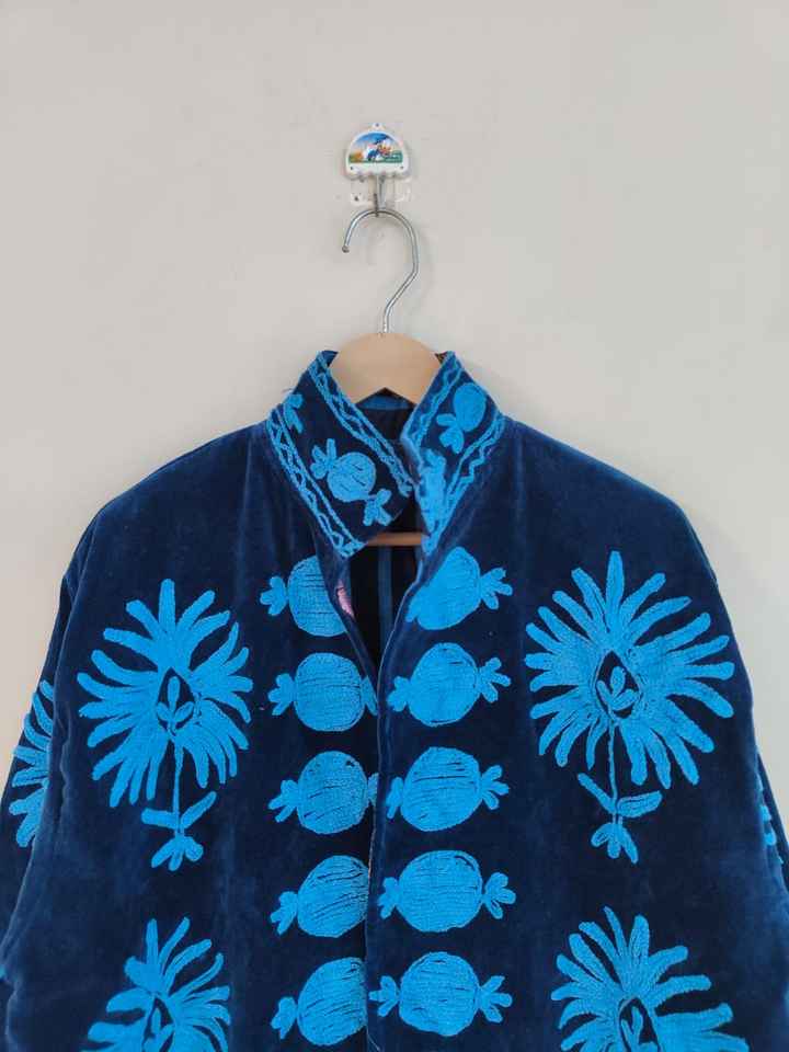 Blue Suzani Embroidered Velvet Short Jacket Handmade Vintage Evil Eye Design Eco-Friendly Reversible Winter Boho Hippie Gift