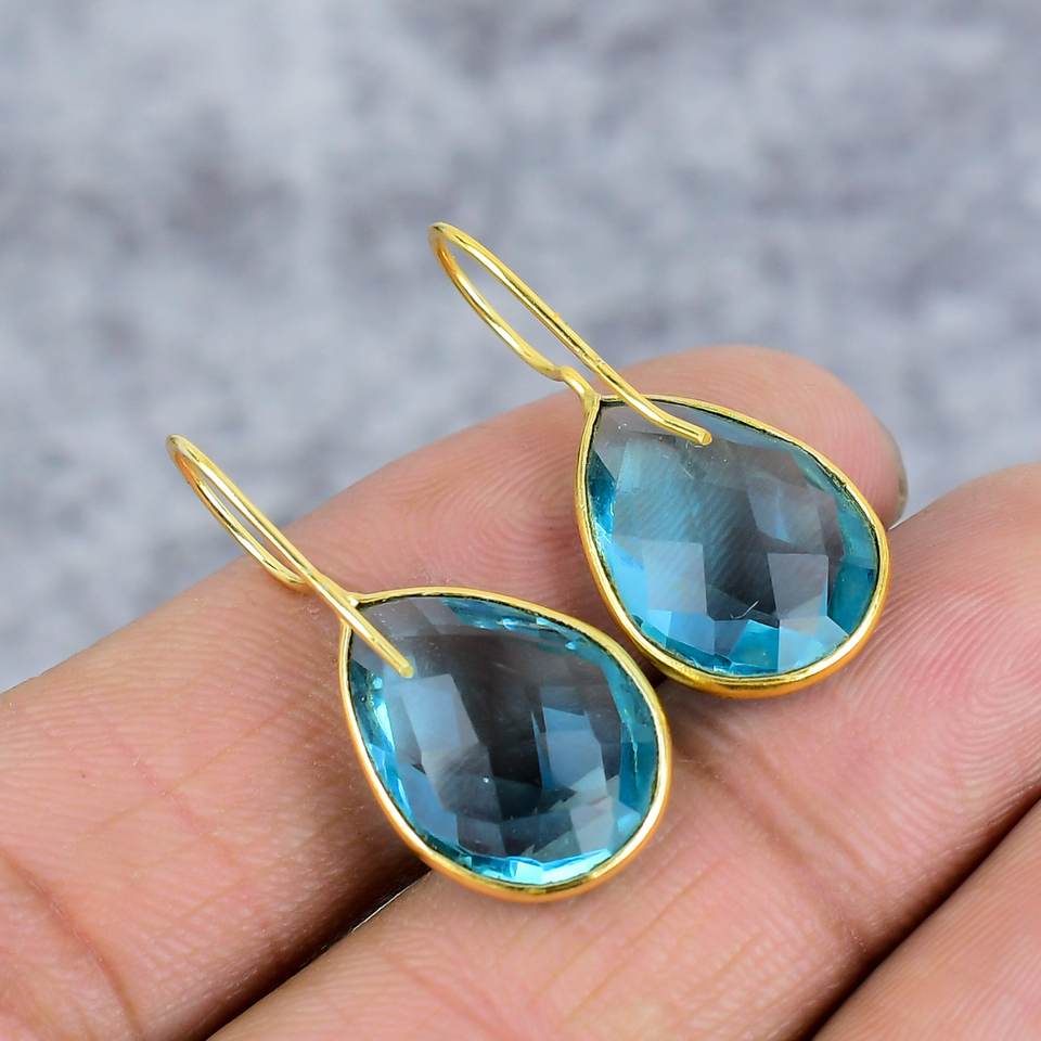 Blue Topaz 925 Sterling Silver Earrings Gold Plating Pear Gemstone Wire Design Stylish Trendy Dainty Wedding Party Accessory