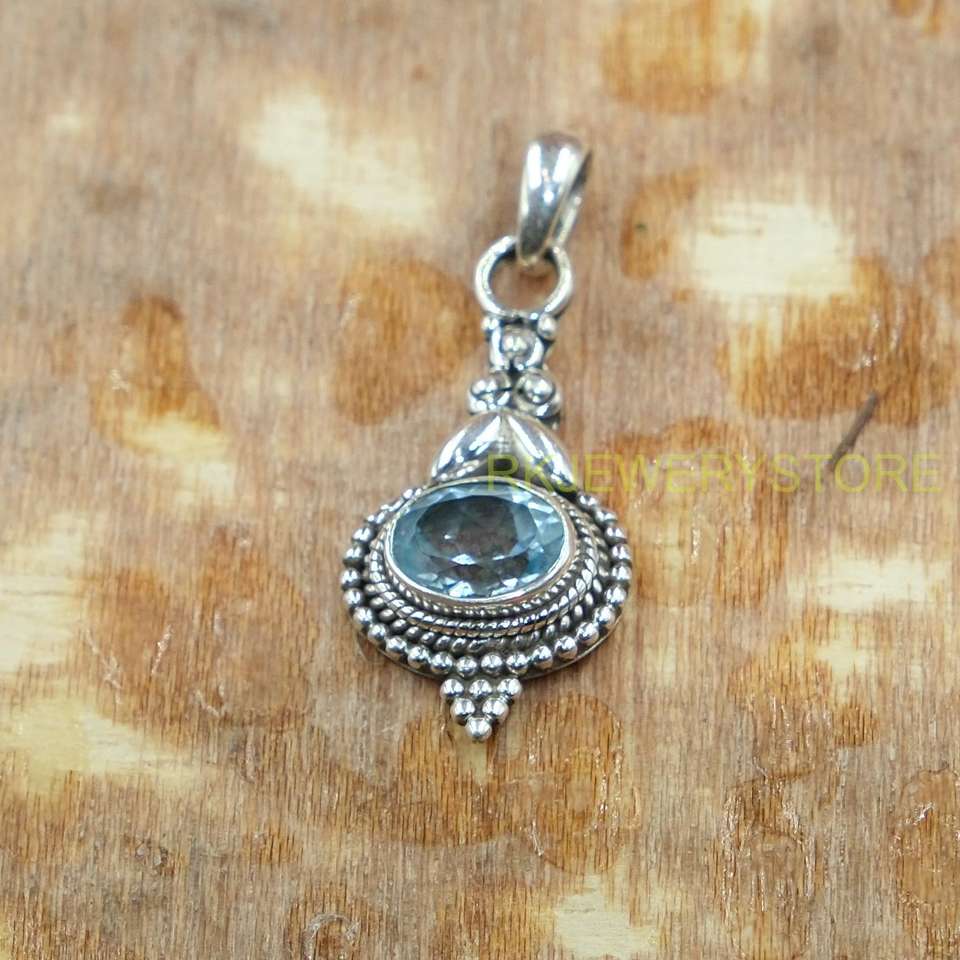 Blue Topaz 925 Sterling Silver Handmade Vintage Style Oval Gemstone Pendant Jewelry gift for women Unisex Girlfriend Her