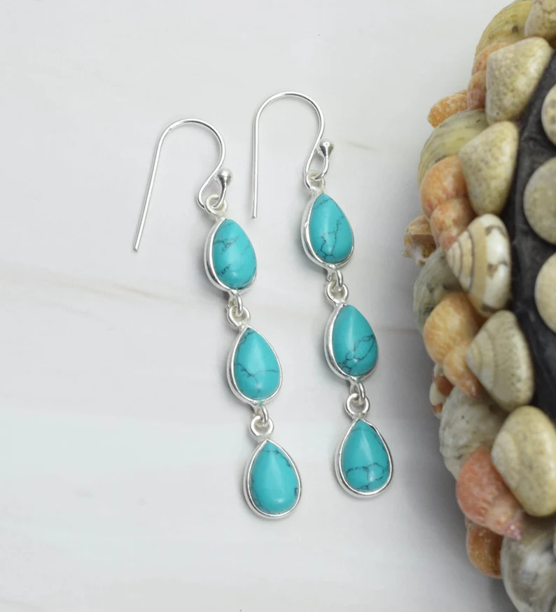 Blue Turquoise 925 Sterling Silver Bohemian Style Gemstone Hook Earrings Handmade 1 Pair Jewelry With 3 Stones Anniversary Gift