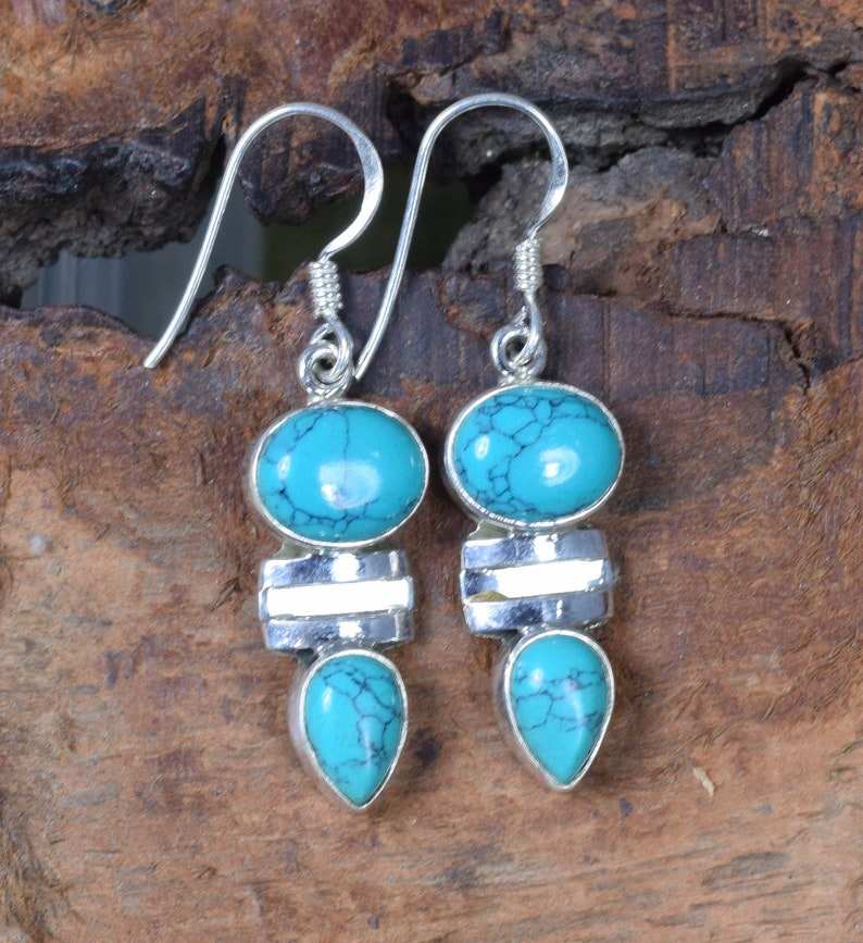 Blue Turquoise Gold Plated 925 Sterling Silver Drop Earrings with Two Stones-Perfect Gift for December Birthdays