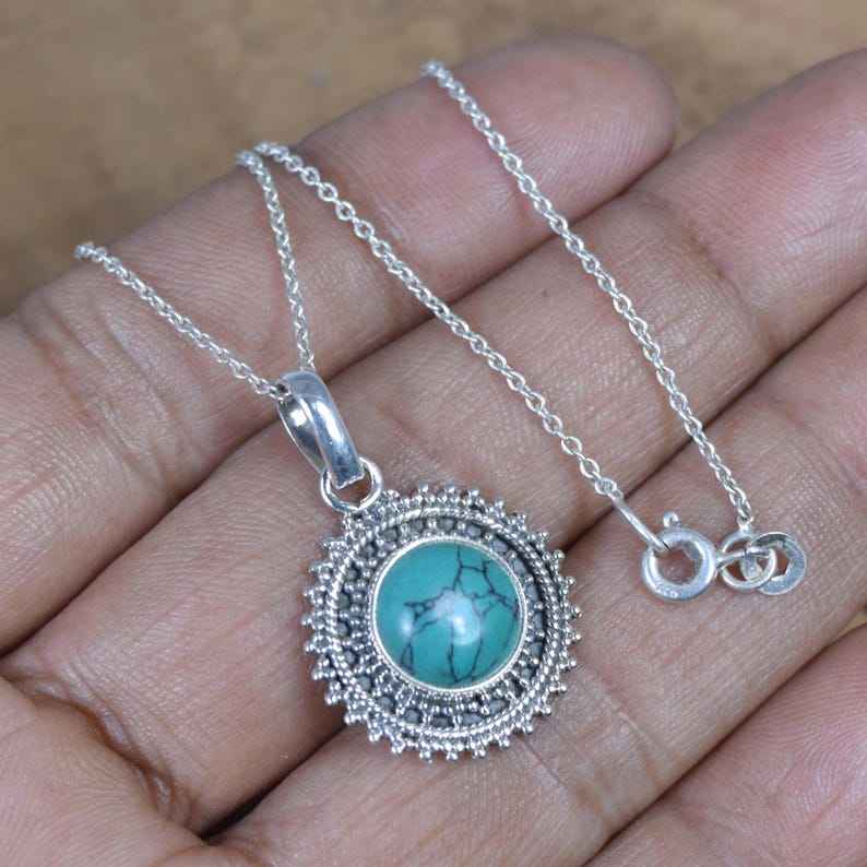 Blue Turquoise Sterling Silver Pendant Necklace Handmade Flower Design Gemstone Jewelry Elegant Gifts Women
