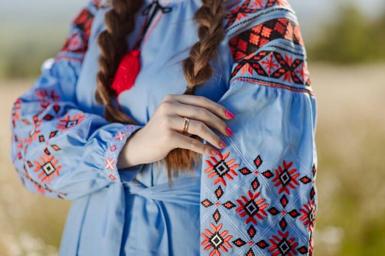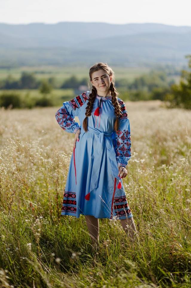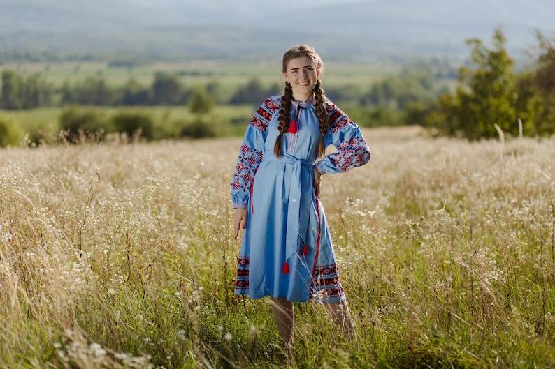 Blue Ukrainian Midi Dress Red Embroidery Cotton Vyshyvanka Bridesmaid Outfit Floral Pattern Slavic Traditional Festival Clothing