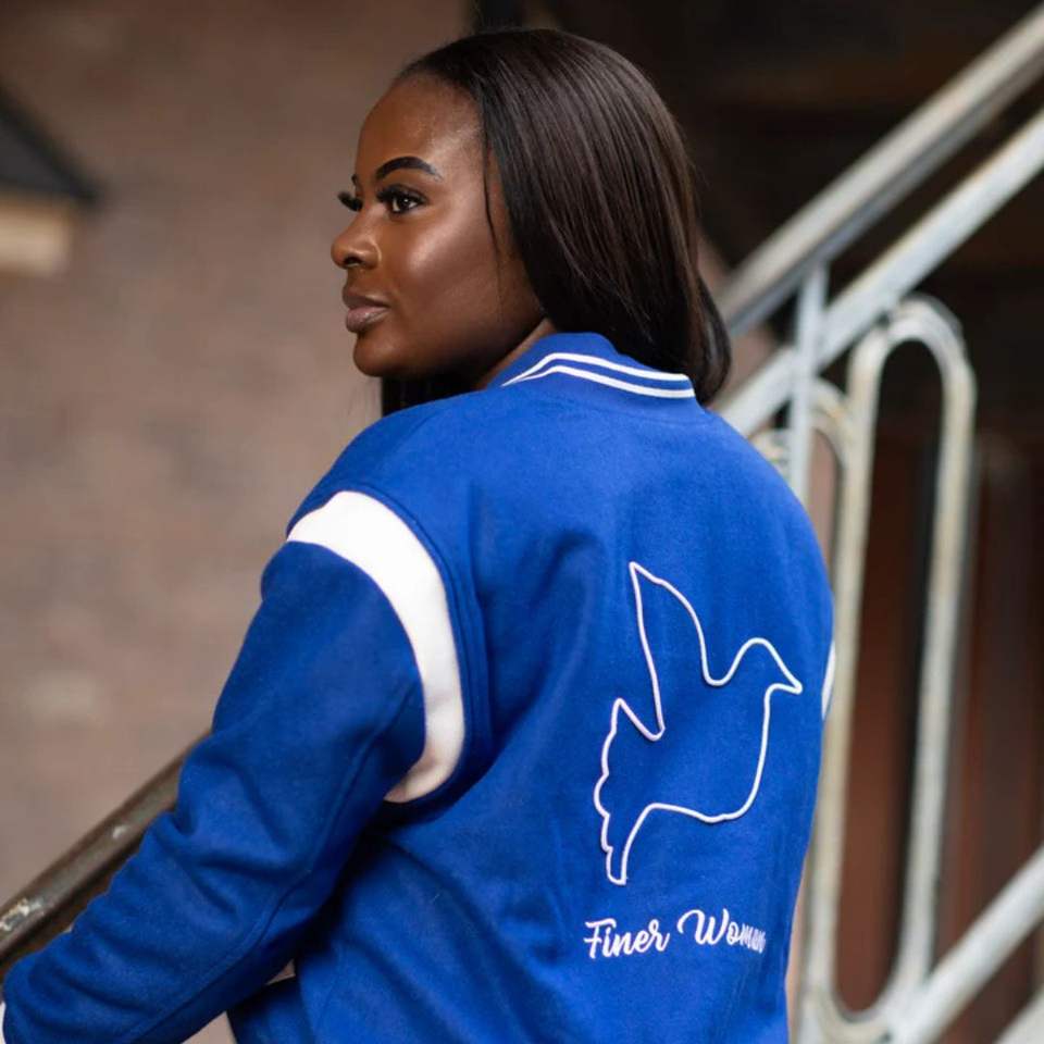 Blue Varsity Bomber Jacket with White Stripes Sorority Style Outerwear for Stylish Greek Life Apparel and Warmth