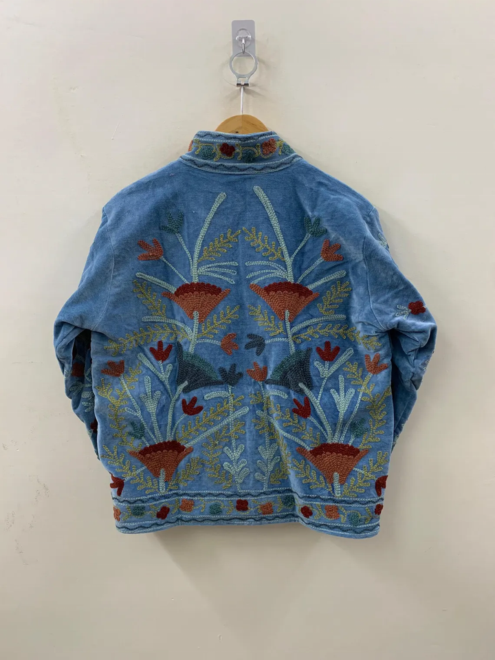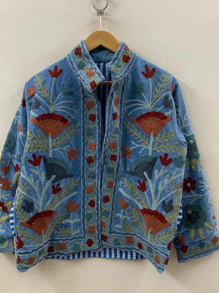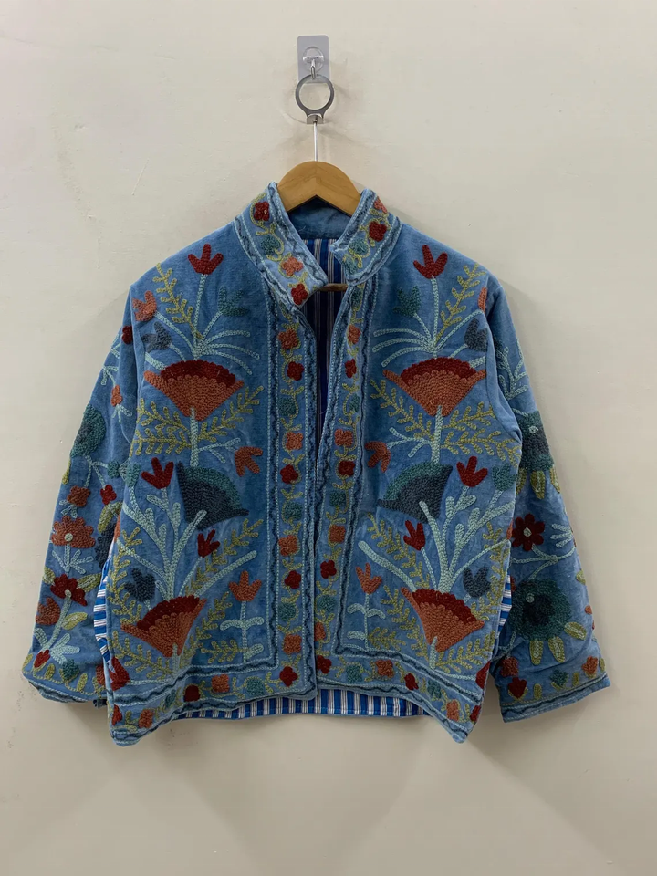 Blue Velvet Floral Suzani Embroidered Boho Coat Uzbek Warm Winter Jacket Cotton Folk Festival Duster Outerwear Breathable Design