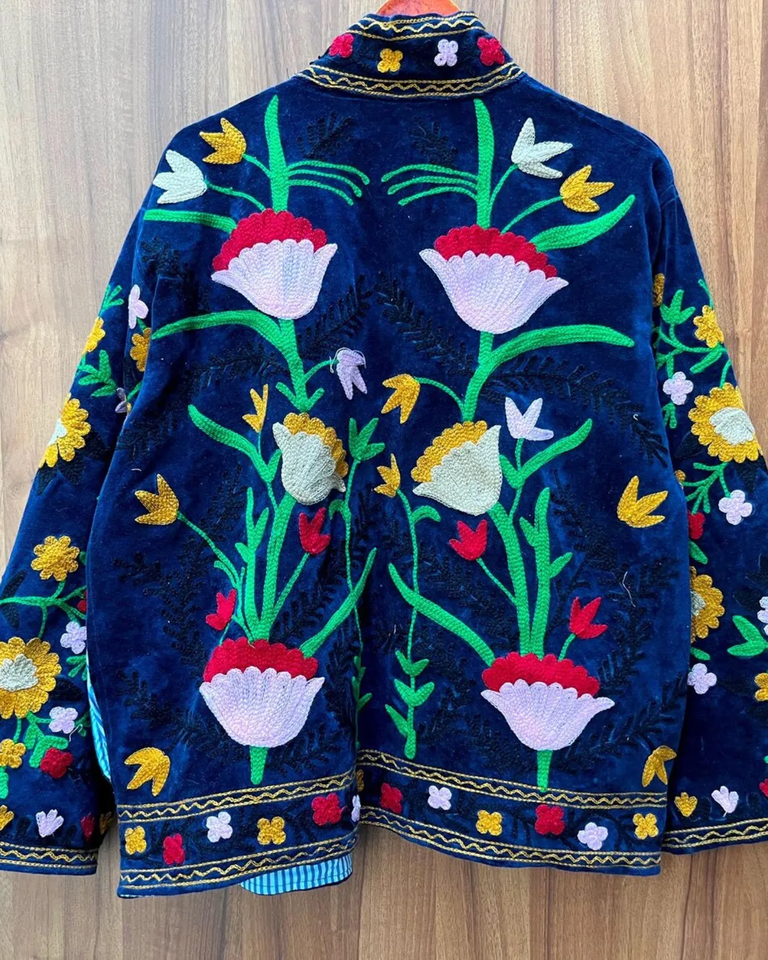 Blue Velvet Floral Suzani Hand Embroidered Boho Coat | Uzbek Warm Jacket | Folk Festival Duster Outerwear