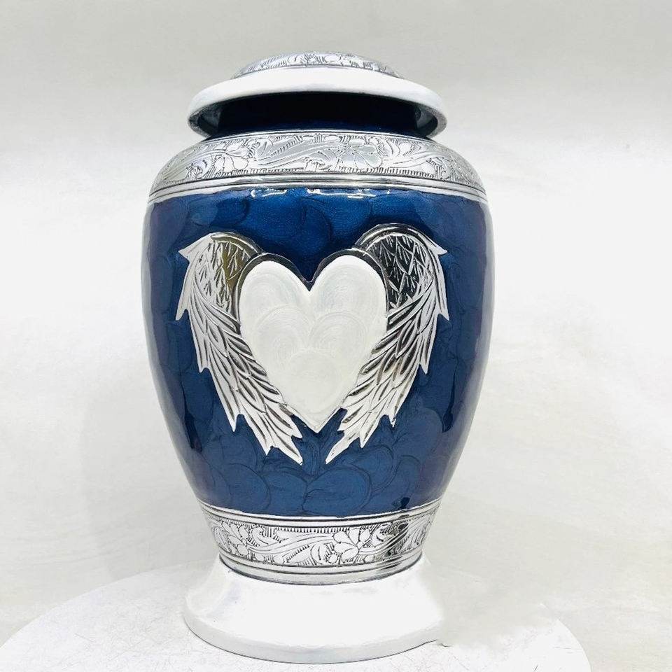 Blue White Angel Wings Aluminium Cremation Urn with Heart Design for Adult Human Ashes Metal Memorial Funeral Keepsake Jar