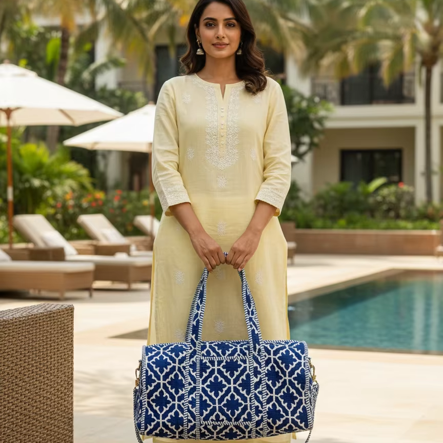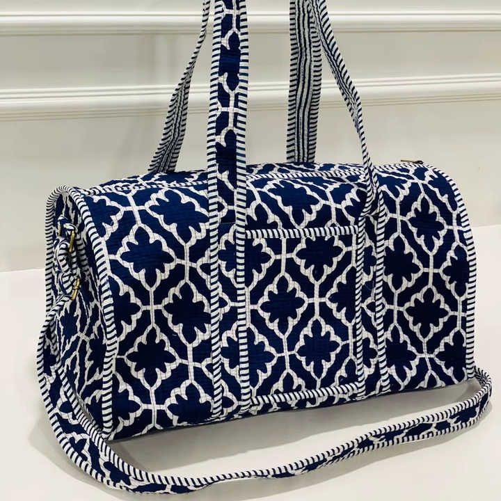 Blue White Geometric Trellis Print Lightweight Eco-Friendly Cotton Travel Duffle Bag Large Capacity Weekend Crossbody Handbag