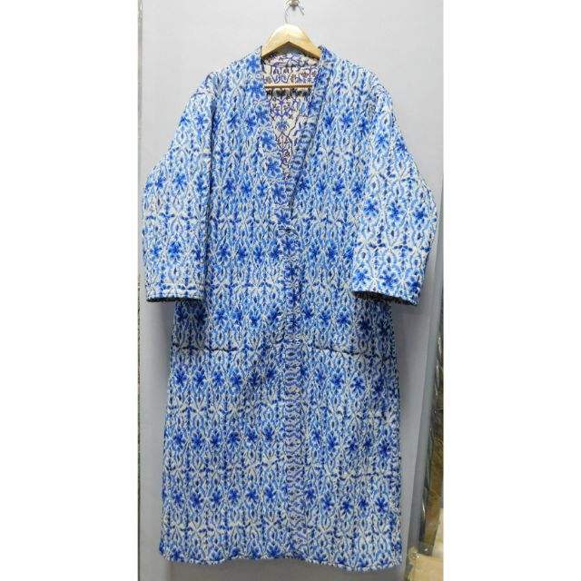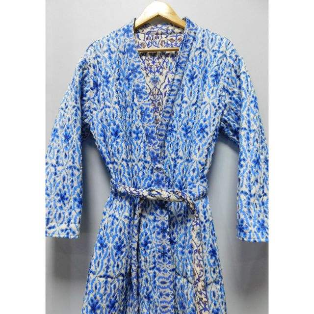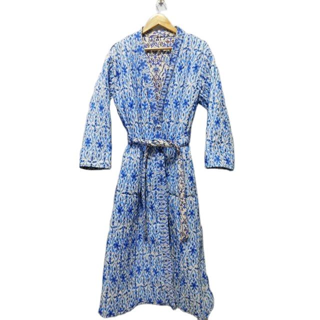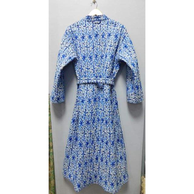 Blue Floral Print Quilted Kimono Bathrobe Long Winter Jacket for Winter Night Wear Cotton for Summer Autumn Spring