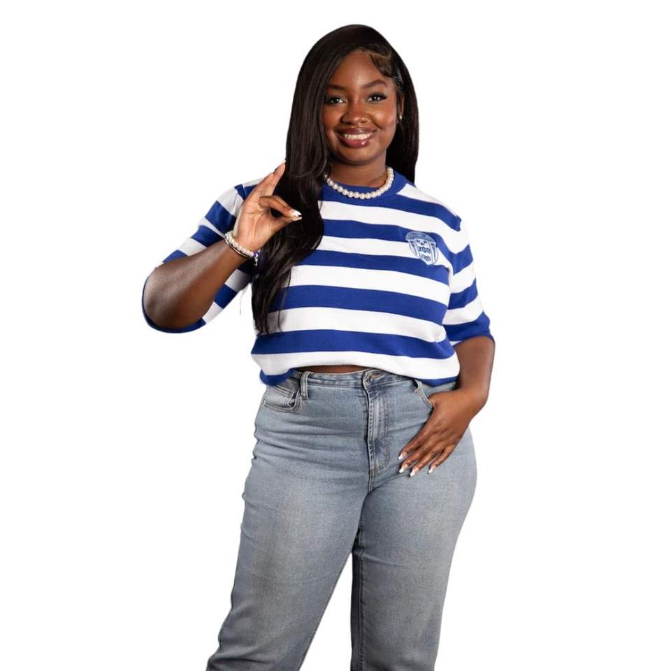 Blue and White Striped Crewneck Sweater Sorority Themed Lightweight Knitwear for Greek Chapter Events and Style