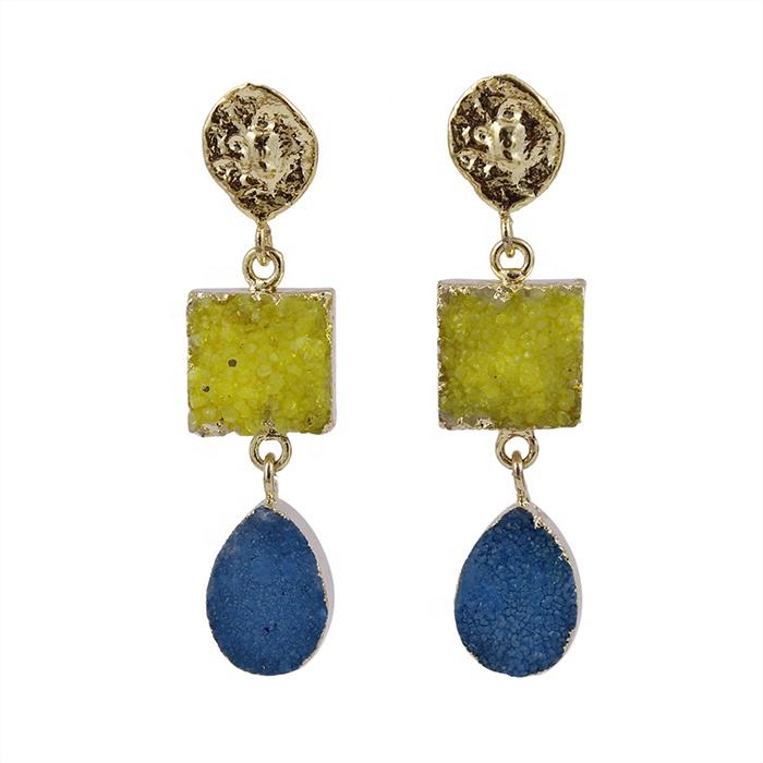 Blue Brown Druzy Gemstone Drop Earrings Gold Plated Handmade Stud Jewelry with Matte Finish Fashion Style