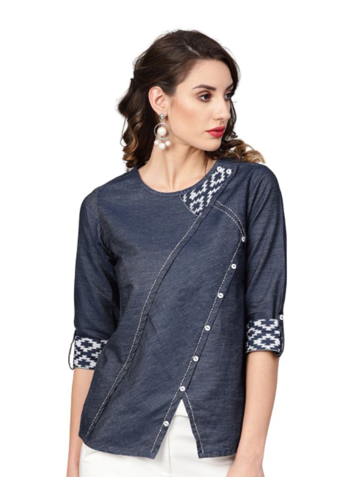 Blue denim regular top with a round neckline and three fourth sleeves styled in an s size fit designed for a simple casual wear