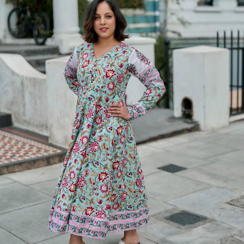 Bohemian Bliss Calf Length Dress Hand Block Printed Floral Blue Pink Casual Occasional Wear