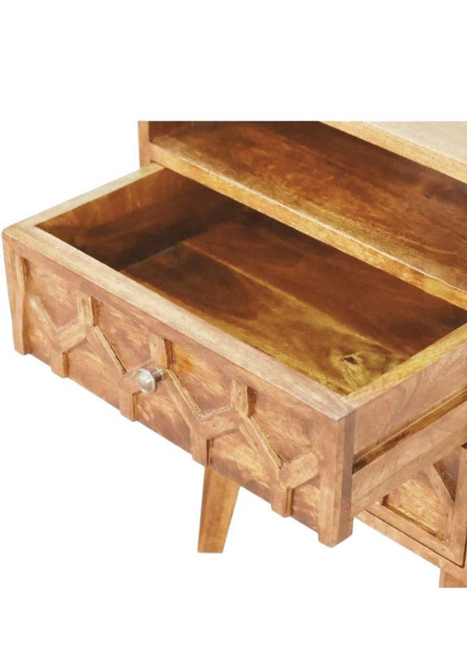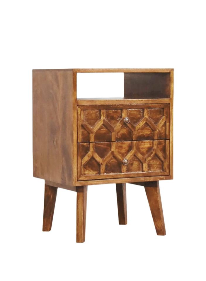 Bohemian Carved Mango Wood Bedside Table with Two Drawers and Open Shelf for Apartment Living Room