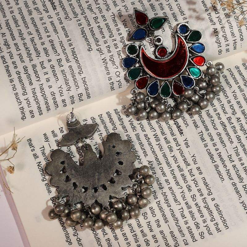 Bohemian Chandelier Crescent Moon Mirror Earrings Silver Plated Brass Multicolor Vintage Afghan Statement Jewelry Party