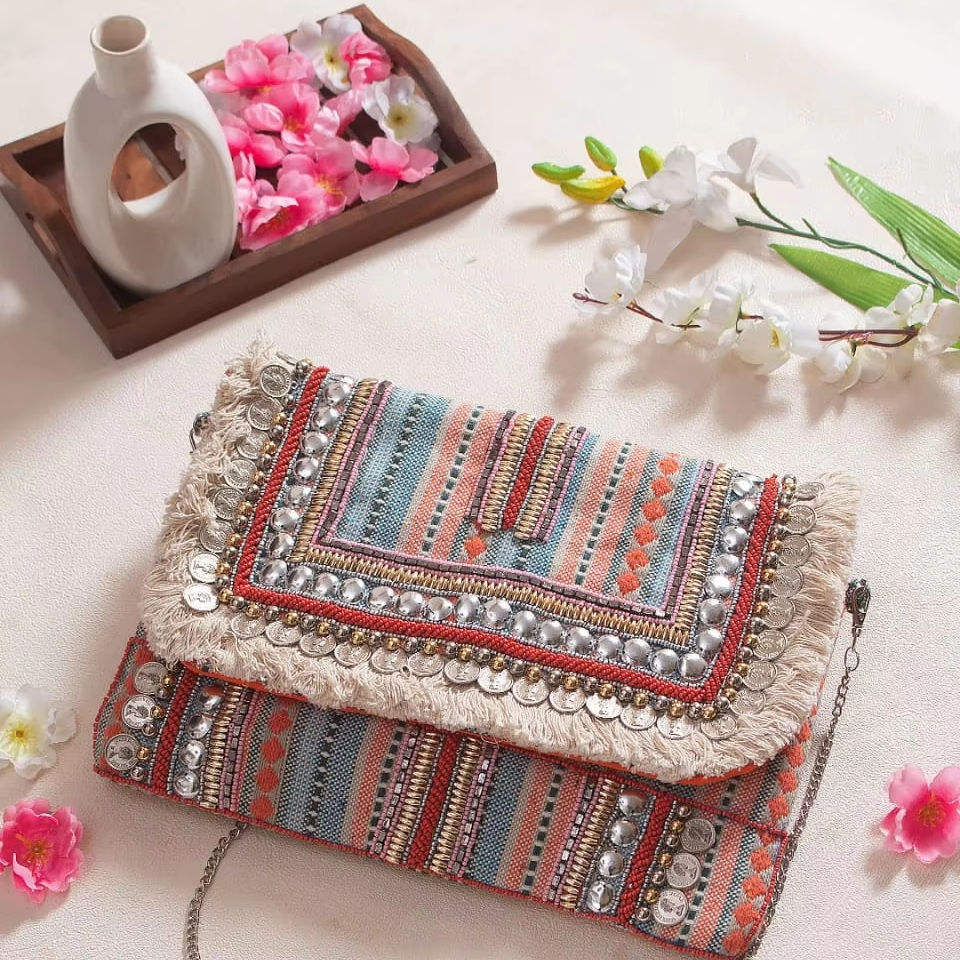 Bohemian Clutch with Cowrie Shells Pom Poms & Fringe Trim Handmade Ethnic Boho Crossbody Bag Unique Beach Festival Purse