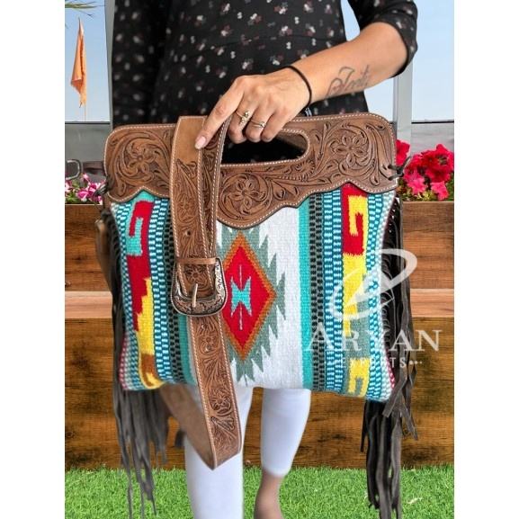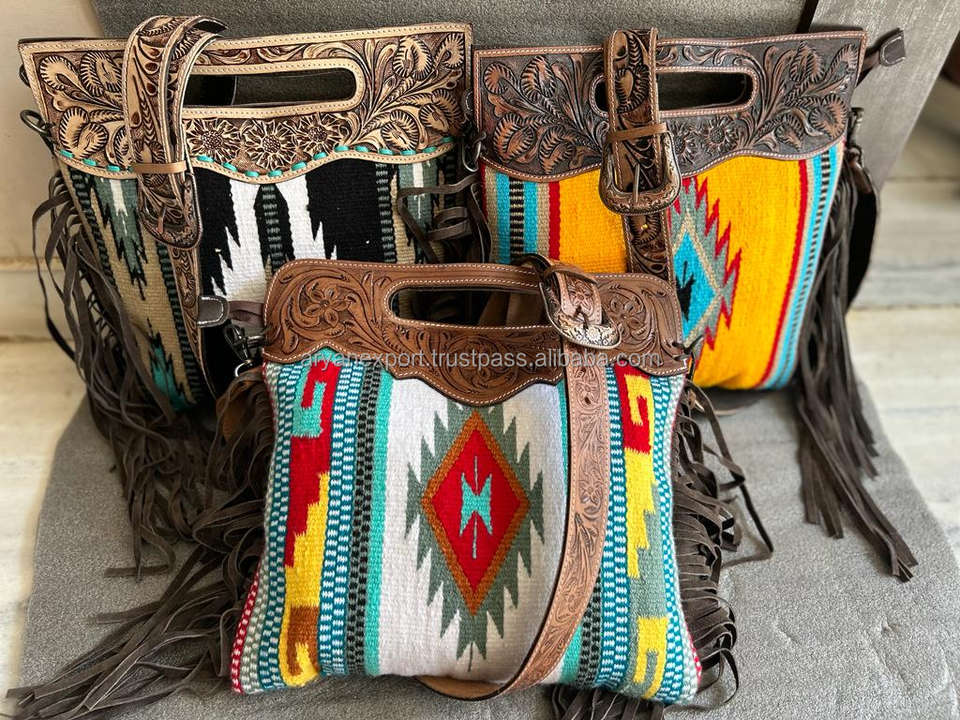 Bohemian Handcrafted Real Tooled Aztec Fabric Fringe Leather Shoulder Bag Hot Selling Genuine Leather Concealed Shopping Handbag