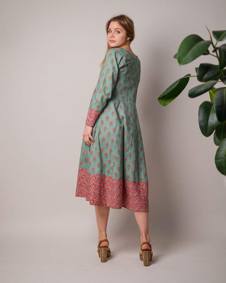 Bohemian Lalana Calf Length Dress Hand Block Printed Floral Green Pink Casual Occasional Wear