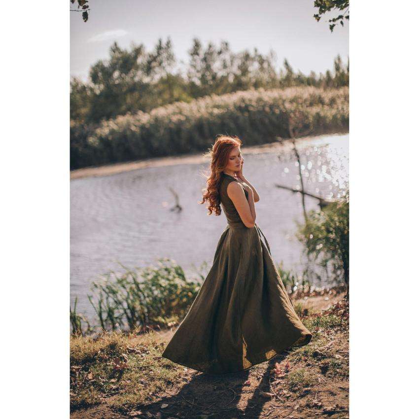 Bohemian Eco-Friendly Linen Wrap Maxi Dress for Women Olive Green Long Sleeve Flowy Belted Sashes Vintage Natural Waist Washable