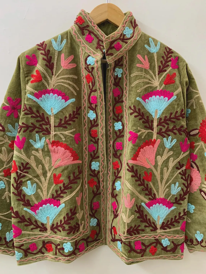 Bohemian Luxurious Velvet Short Coat with Floral Embroidered Suzani Striped Cotton Lining Handmade Winter Gilet Free Size