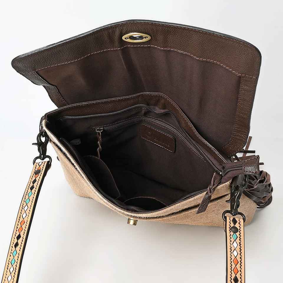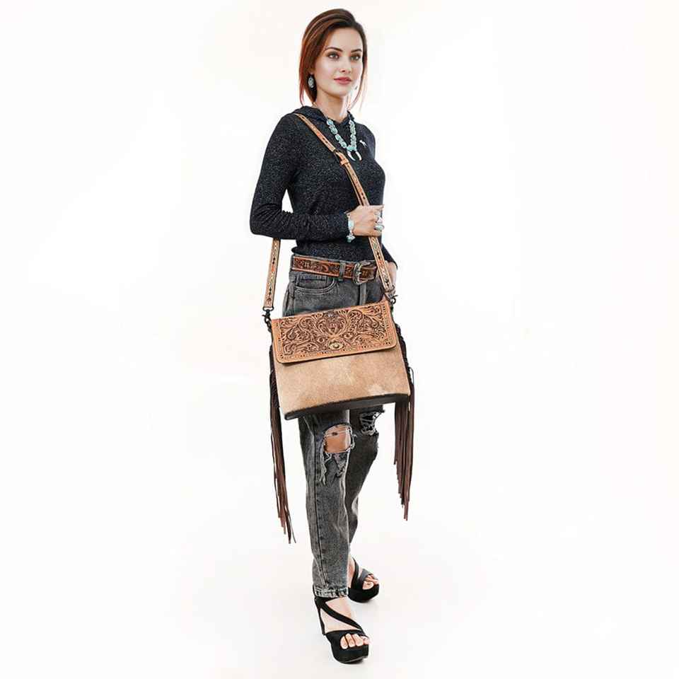 Bohemian Luxury Fur Leather Sling Bag for Women Western Style Floral Solitaire Carving Cowhide Hair Flower Design Zipper Bag