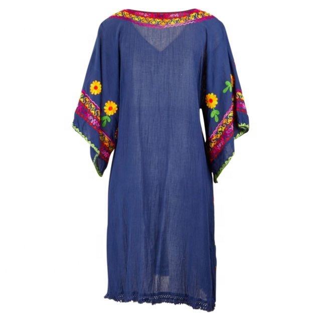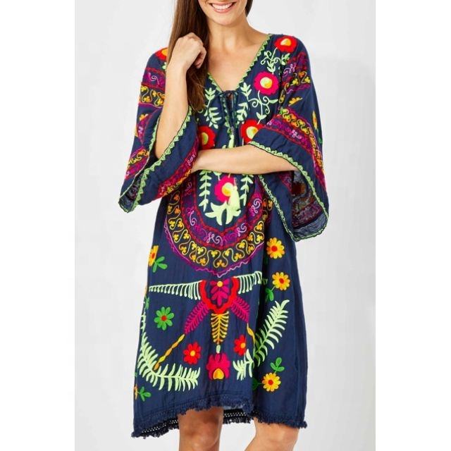 Bohemian Neon Aari Embroider Bright Fluorescent Colour Summer V Neck Neckline Tie Tassel 3/4 Bell Sleeve Women Beach Wear Tunic