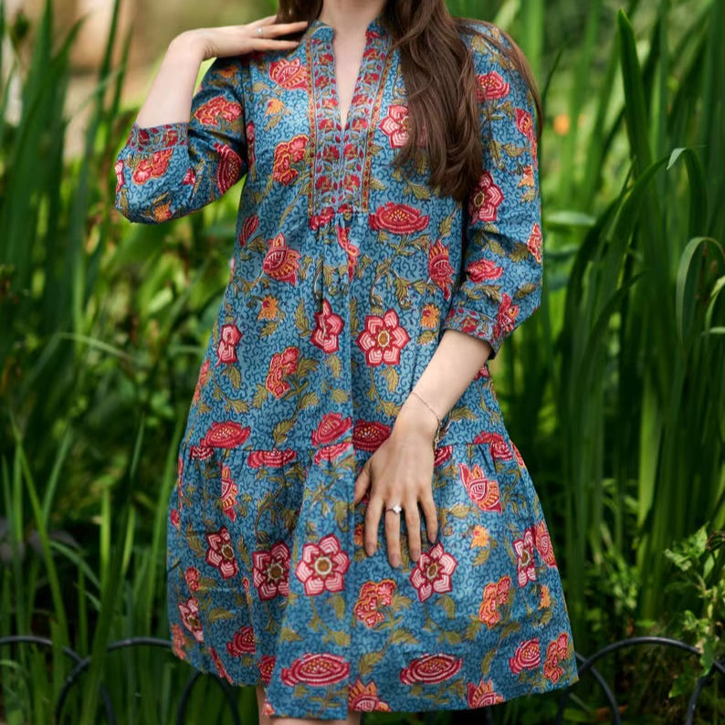 Bohemian New Japanese Garden Dress Hand Block Printed Pure Cotton Floral Blue Red Casual Wear