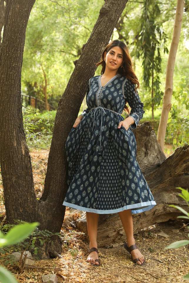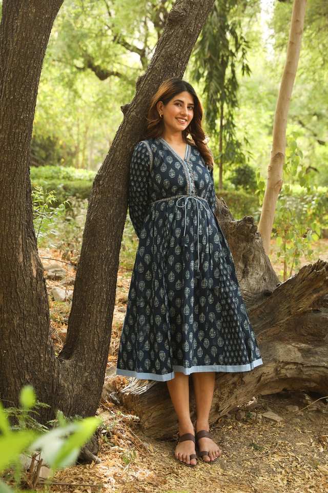 Bohemian New Vandana Midi Dress Hand Block Printed Pure Cotton Floral Navy Blue White Casual Wear
