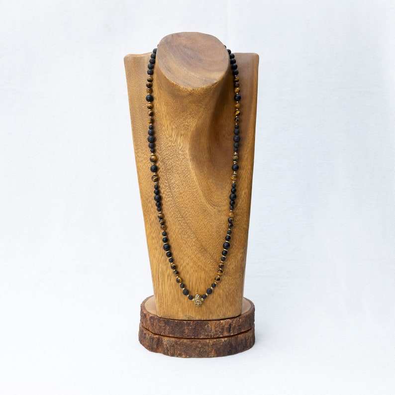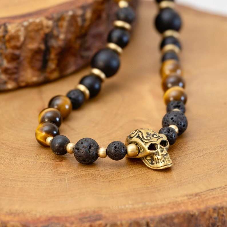 Bohemian Skull Man Necklace, Memento Mori Tiger Eye Skull Chain, No Fear Male Necklace, Black Lava Chain, Unique Piece