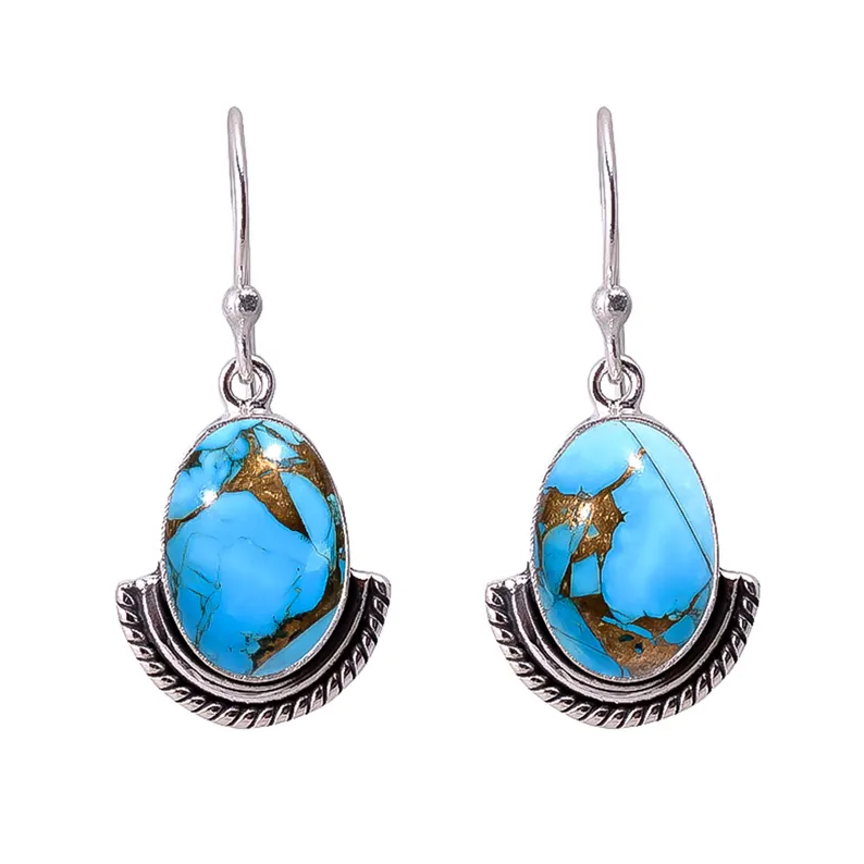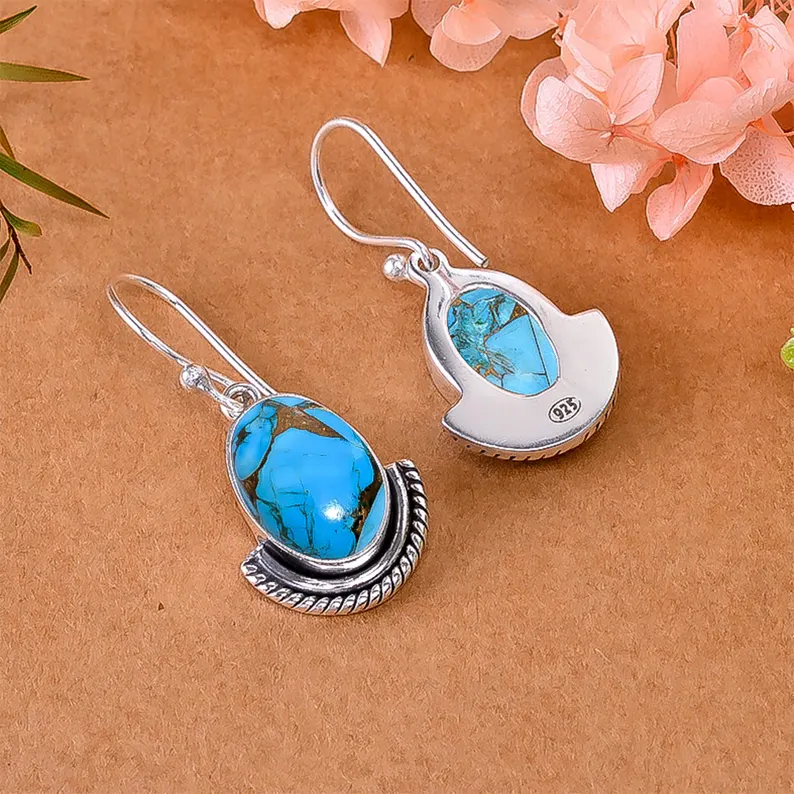 Bohemian Style 925 Sterling Silver Hoop Earrings Copper Blue Turquoise Gemstone Drop Dangle Handmade Christian Religious Jewelry