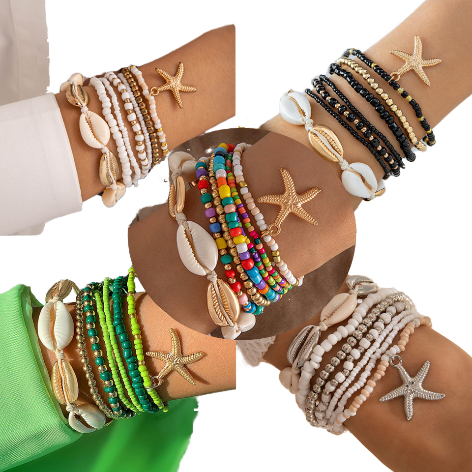 Bohemian Style Multi-Color Shell Beads Woven Starfish Rice Beads Bracelet Set Anklets Jewelry for Beach Vacation Party Gift
