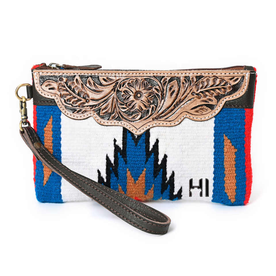 Bohemian Trending Woolen Saddle Blanket Women Hand Clutch Wristlet Wallet Fashionable Tooled Leather Zipper Cowhide Fringes