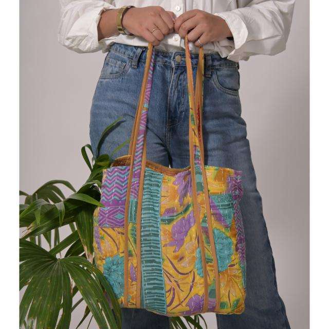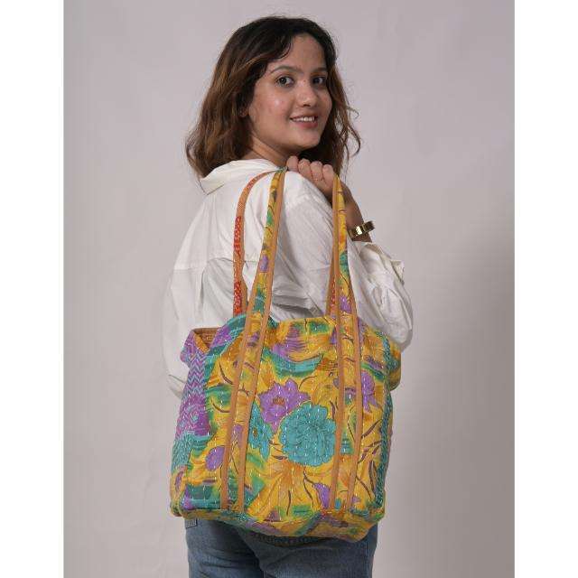 Bohemian Vintage Kantha Cotton Tote Bag Handmade in India with Two Straps Multicolor Women's Shoulder Bag for Shopping Daily Use