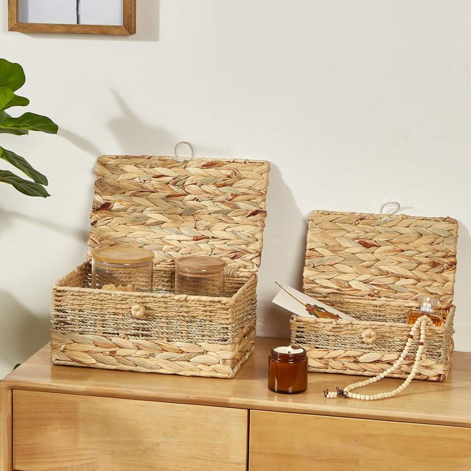 Handmade Bohemian Wicker Storage Baskets Lids Natural Rattan Water Hyacinth Decorative Boxes Seagrass Christmas Storage Boxes