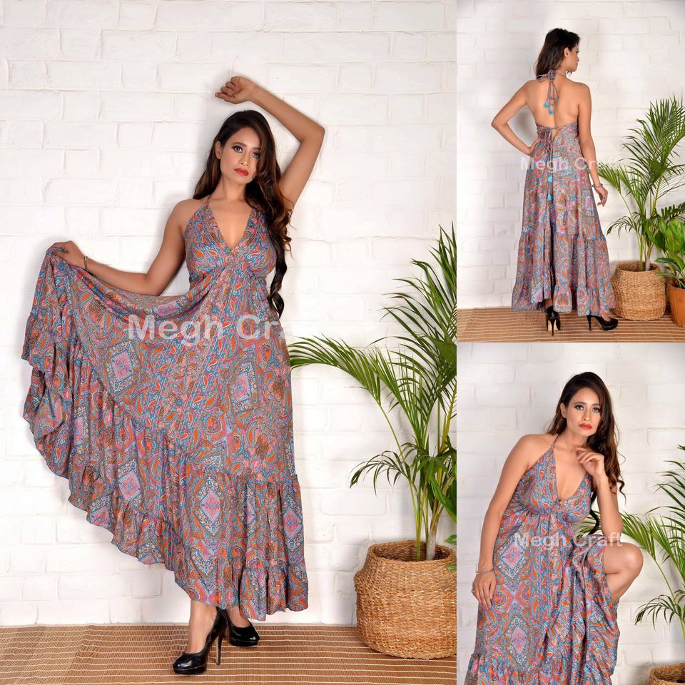 Bohemian Beach Wear Silk Dress - Summer Beach Wear Indian Silk Sari Ibiza Dress- Ladies Fashion Maxi Silk Dress