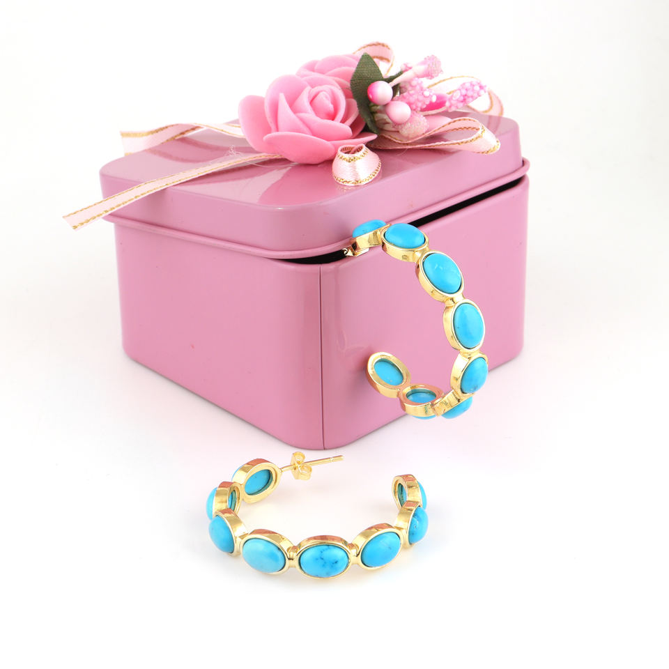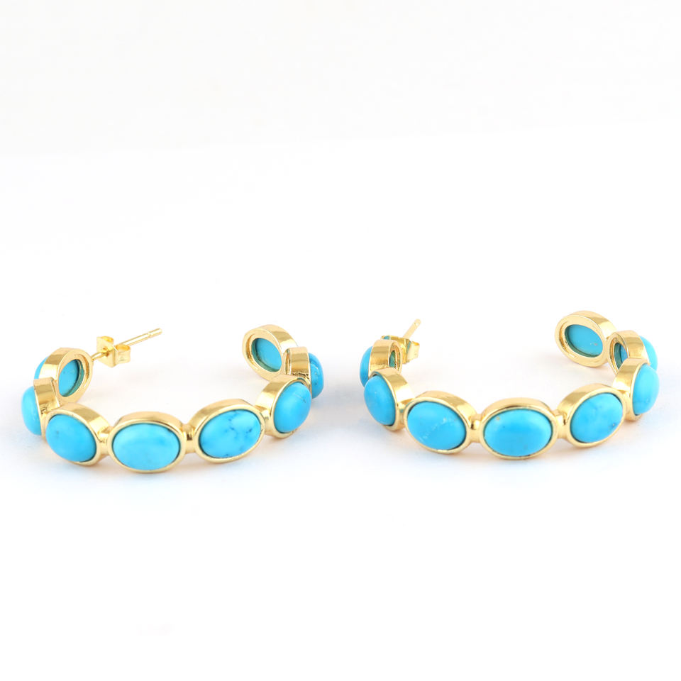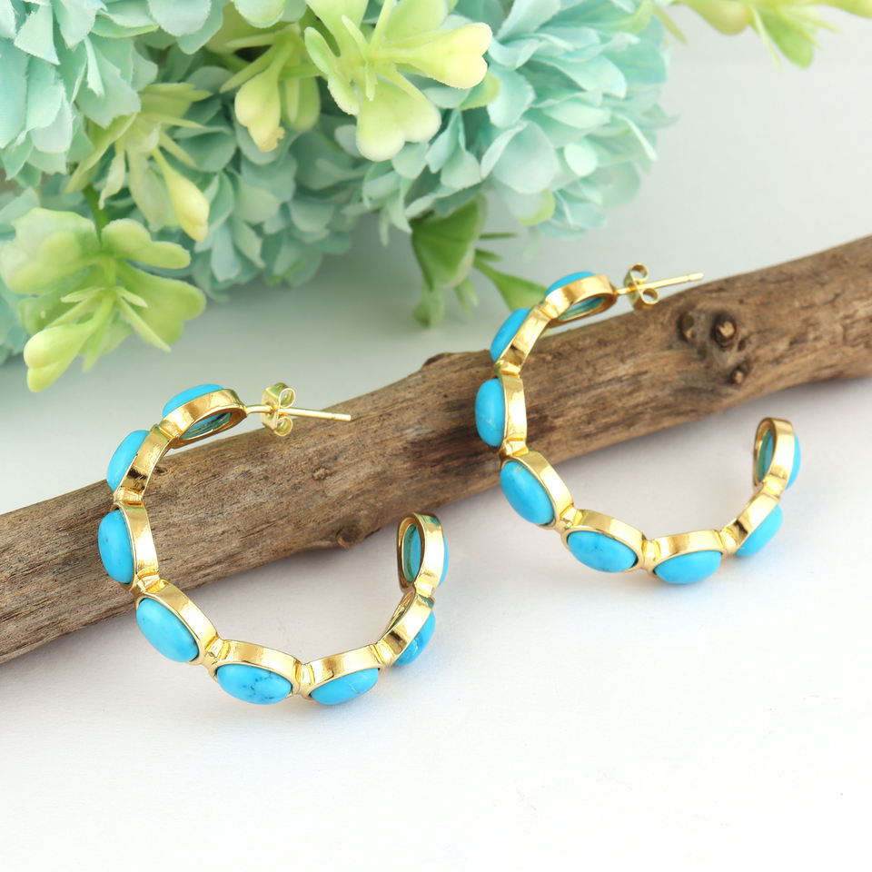 Bohemian jewelry blue stone turquoise hoops earring solid brass 18k gold plated multi oval stone half circular hoops for women