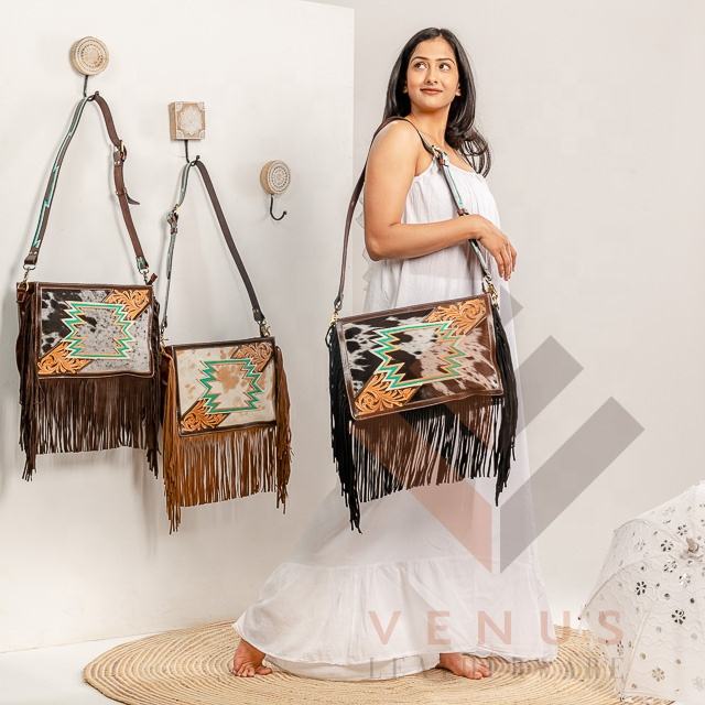 Bohemian Tooled Cow Hide Hair On Genuine Leather Fringe Crossbody Sling Bag Stylish Gypsy Sling Bags Handmade Fringe Sling Purse