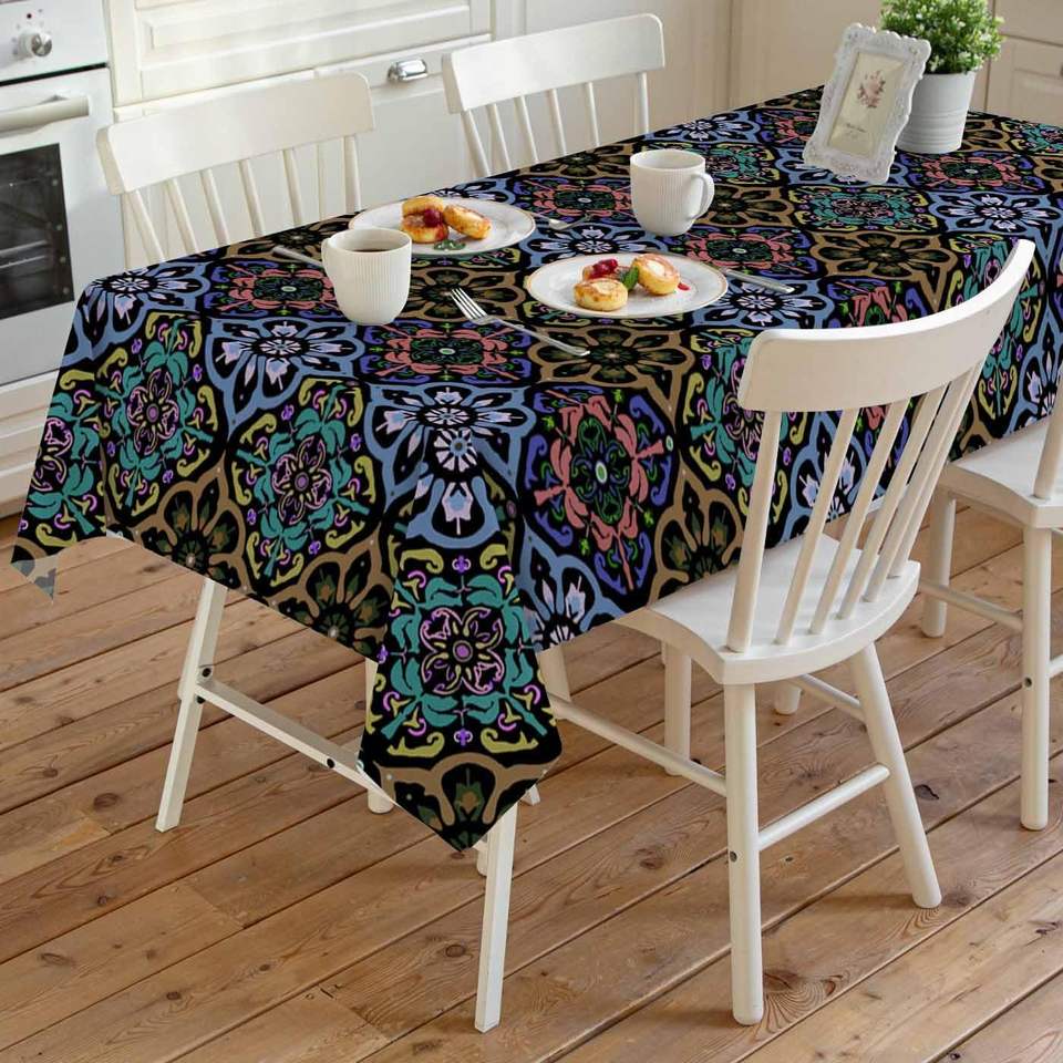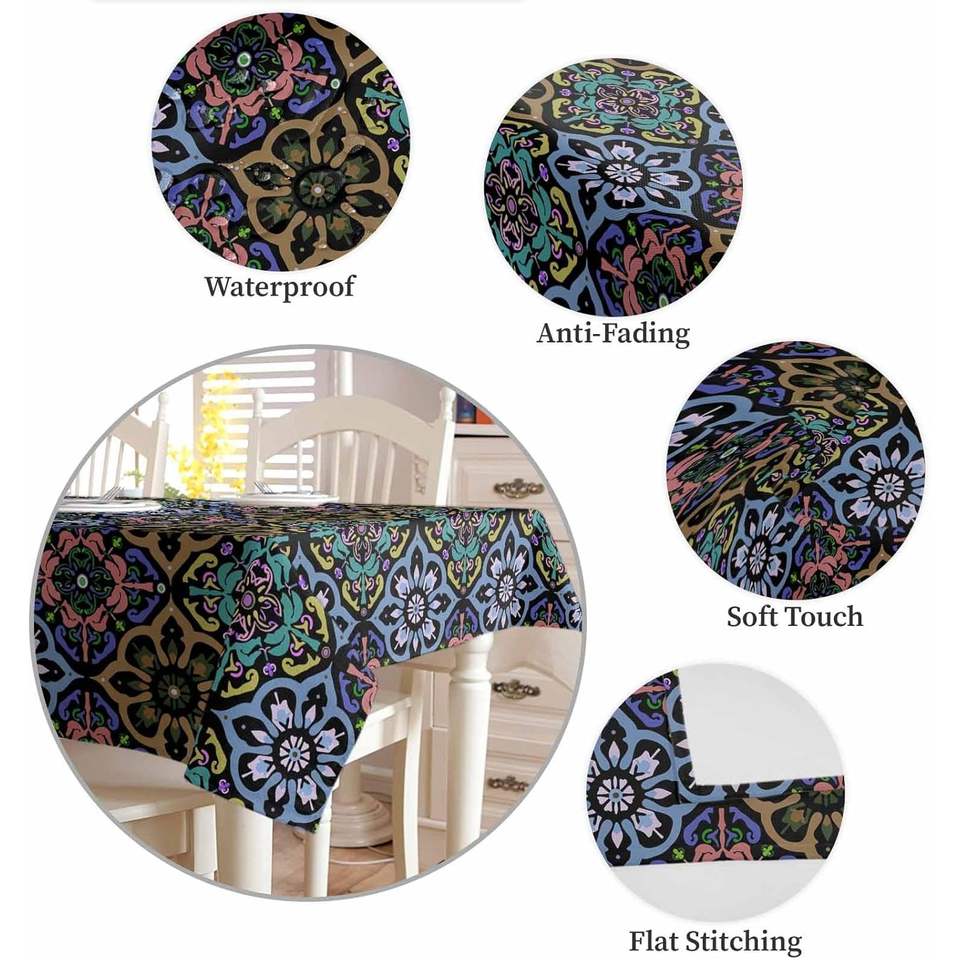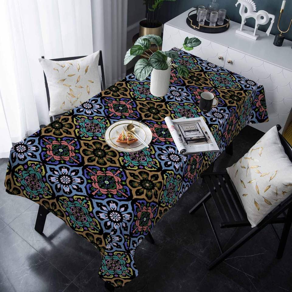 Boho Blue Flowers Square Tablecloth 100% Polyester Damask Ethnic Original Tribal Style Home Decor Original Stock