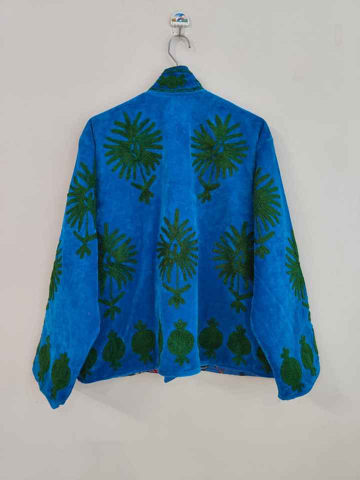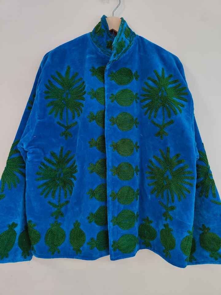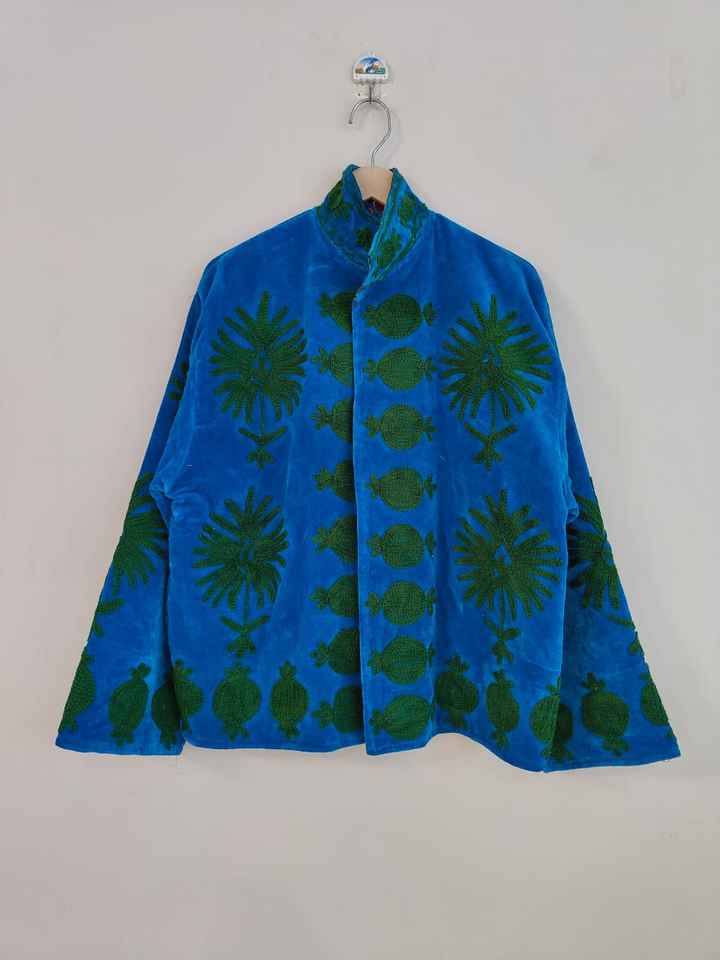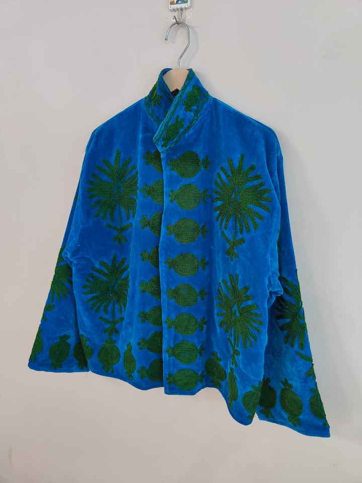 Boho Blue Velvet Suzani Jacket Embroidered Winter Coat, Velvet Suzani Embroidered Jacket: Bohemian Artisanal Coat