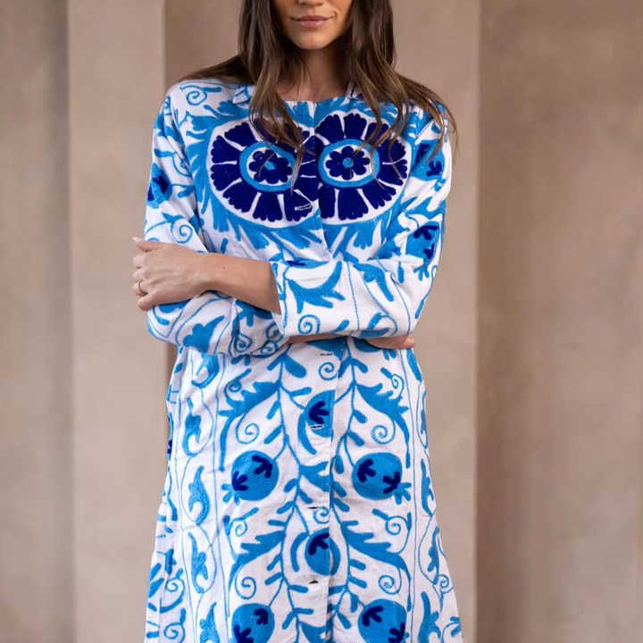 Boho Chic Floral Suzani Cotton Outerwear Jacket High Quality Raw Edge Coat with Button Decoration Latest Winter Collection