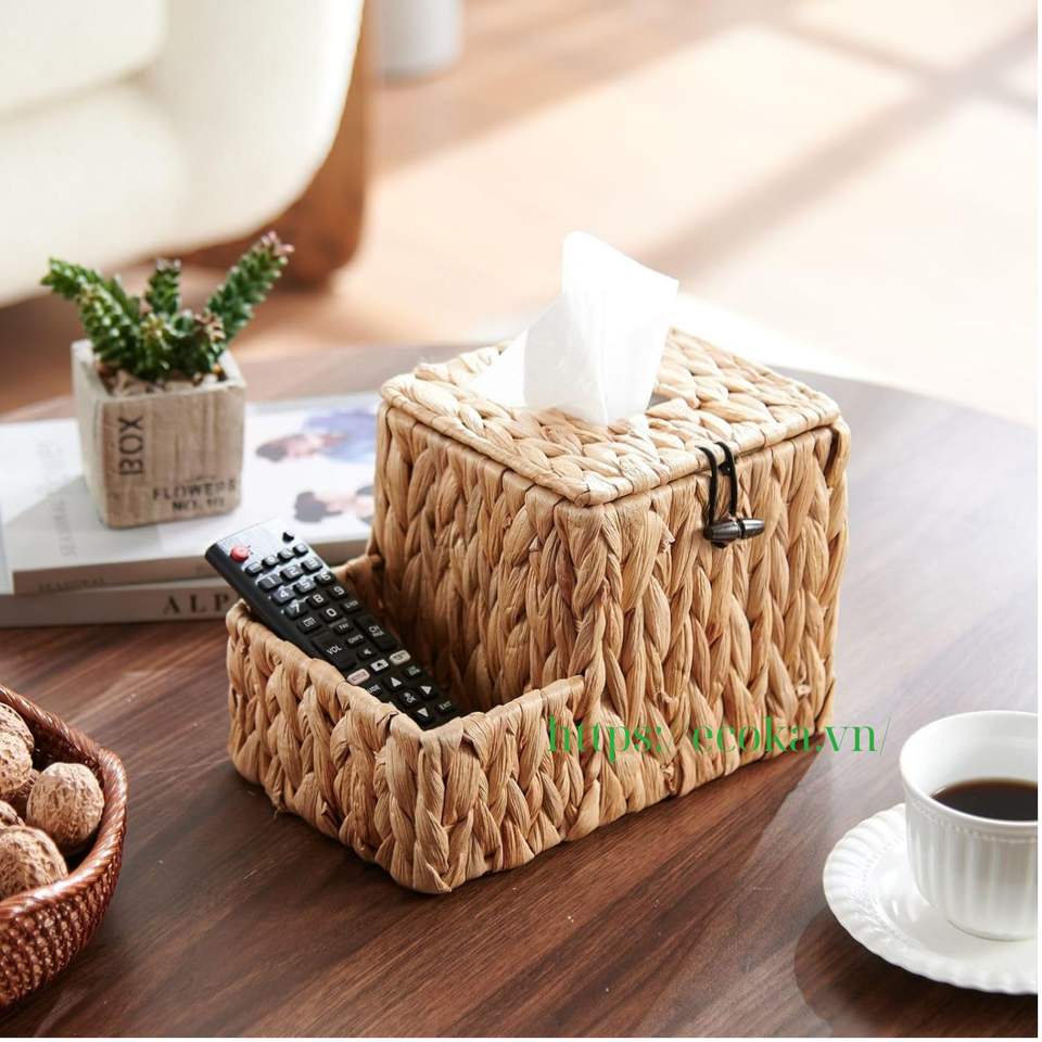 Boho Eco-Friendly Decorative Multifunction Bedside Storage Baskets Rectangle Rattan Tissue Box Cover Water Hyacinth Nightstand